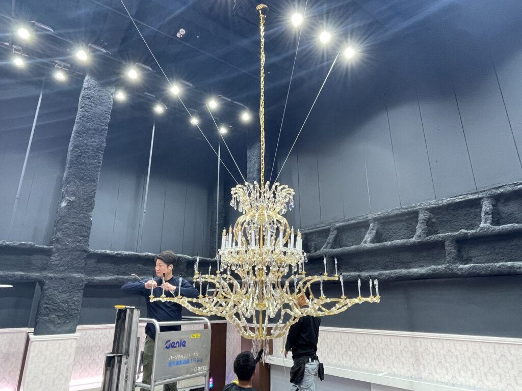 河原郁子NY・シャンデリア東京の超大型シャンデアEMPRESSを東京都内の商業施設に納品し、修復メンテナンスをしながら設置しているときの画像