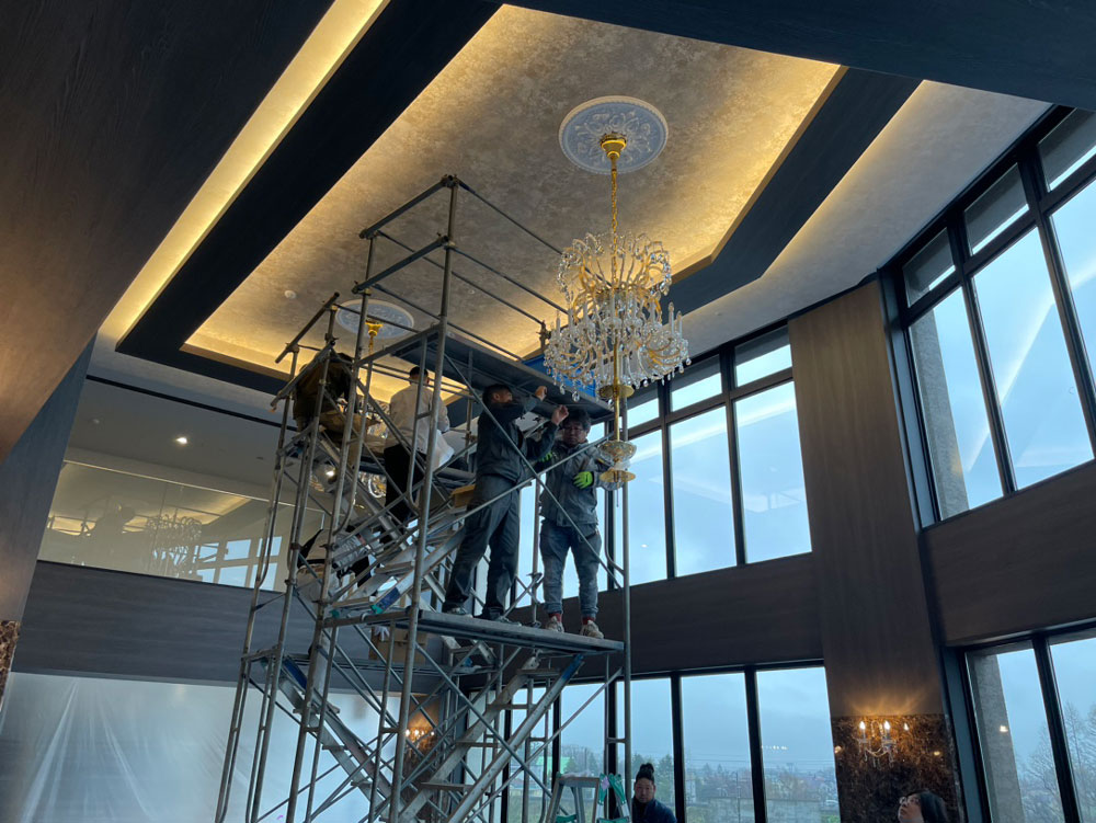 東京・池袋の新築マンションエントランスに大型高級シャンデリアを特注オーダーメイド製作し、組立設置している様子です。