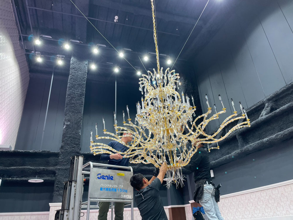 シャンデリアは安全に、そして綺麗なデコレーションで設置納品しているときの画像