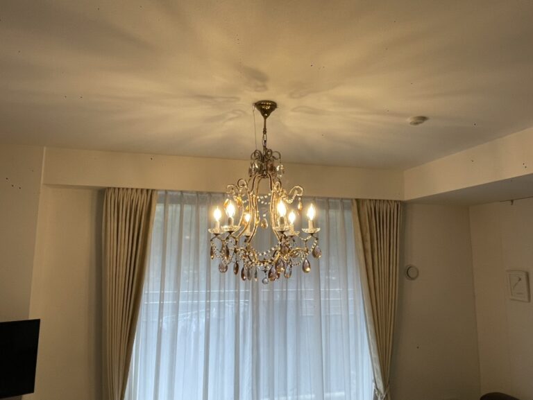 東京都内の高級マンションのリビングに、修復後、取付設置まで河原郁子NY・シャンデリア東京にお任せいただけました。