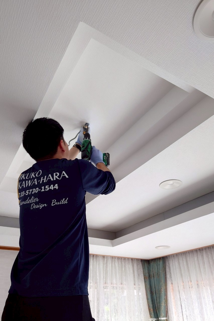 河原郁子NY・シャンデリア東京では、取り付けたシャンデリアが自身で落下してきたケースが過去に一度もございません。創業からの60年間で大きな震災もありましたが、当店のスタッフが取り付けいたしましたシャンデリアはひとつも落ちることなく、安全で適切な方法で吊るすことができていると証明してくれました。